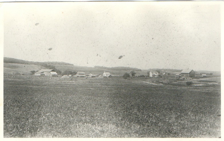 | An interesting view of a well known area in Johnson Valley. The date of this photo is either 1901 or 1902. The Esten Johnson Dahl farmstead lies directly in front of the camera, rented at that time by son John J. Dahl. Across Spring Creek was the home of brother Gilbert Dahl. Just past his windmill we have a glimpse of Nels Kleven's home. And over Esten's blacksmith shop is the white Johnson Valley School. Three things date the picture as prior to 1903. The school had no entry shelter until that year. Gilbert Dahl's barn burned that year and was replaced by the present hip-roof structure. The size of the pines around the house is also a clue. The valley was named in Esten's honor as he was the first settler. |
