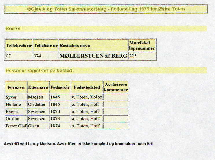 | Syver Madsen Family in 1875 Norway Census Matson - Garson Genealogies | Home | Page Index | Pictures | Reports | E-Mail Matson |