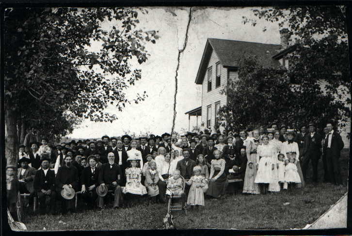 | Arup Garson is the child in the chair in the front row. A son of Nels and Clara (Frodahl) Garson, Arup recently lost a leg to infection. Nels and Clara are the parents of Helfred Matson's wife, Mary (or Marie). I apologize for the quality of this scanned picture. With a magnifying glass, you may be able to see it better even from the Internet. The point of the gathering, however, is clear. Lots of support! Per my Aunt Mariann Berg's notes, (Mariann Matson, daughter of Helfred and Mary): After Sunday Services at Nels Garson Farm, August 12, 1900 - Arup (in chair) had had his leg amputated - the day was a congregational picnic meal for the family. (The) Pastor in front center is Pastor Helsem. Grandpa Sever Matson is 2nd on left next to man holding hat. Behind Arup is Grandma Clara & Granpa Nels. Next to Grandma is Natalie (age 8). Standing by Arup is Ellen (age 4), Arup was age 6. Next to Grandpa is Thora (age 10). Next to Thora is Maria who was 16. Isn't she daintly? Two rows behind Grandma Clara is Helfred (wide brimmed hat and white shirt). He was 21. His younger brother, David, who was 15 is to the left of Grandpa Sever - wide brimmed hat & white long sleeved shirt. David died shortly after (this picture) from heart disease - buried in Strum Cemetery. This picture is very typical of Ellen & Arup. They were inseparable - Ellen thought she had to take care of Arup although he was 2 years older. |